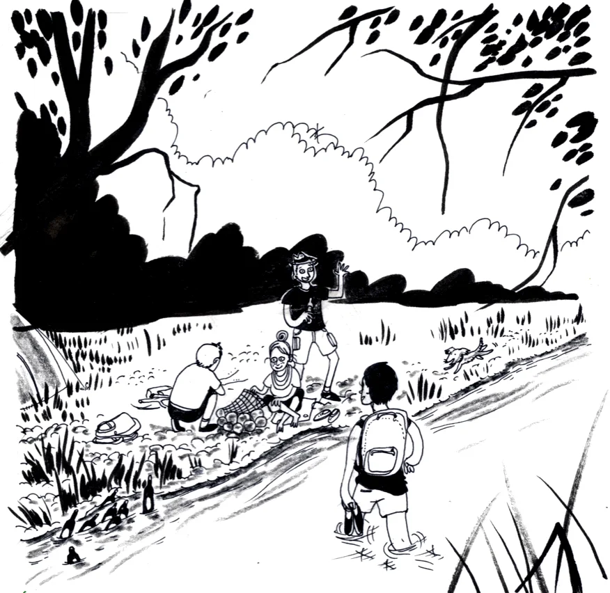 Bei der Location habe ich mich an einem kitschigen Foto der Wolfszahnau orientiert. Die Ecke ist herrlich idyllisch und nicht weit von mir entfernt. Augsburgs Flüsse fließen dort zusammen und bilden einen „Wolfszahn“. Nach einer krageligen Farbskizze habe ich mit Gel-Pen und Tusche die Lineouts gemacht (siehe Bild), und dann am Rechner digital coloriert. Die Farbe gefällt mir super gut und fühlt sich so richtig energiegeladen nach Sommer an.